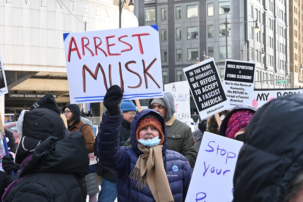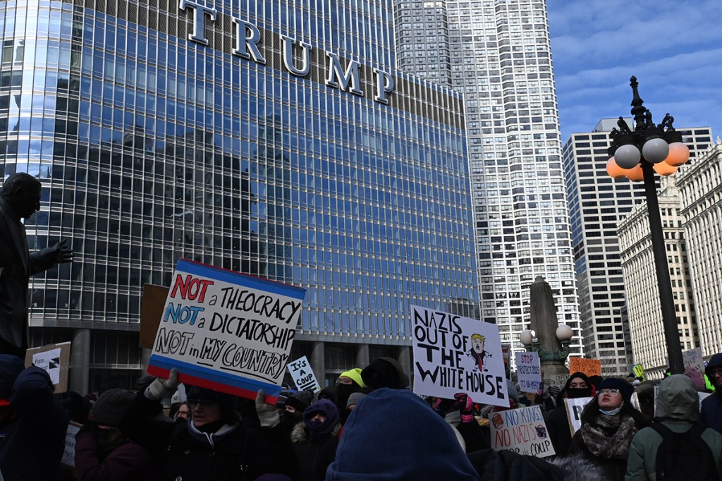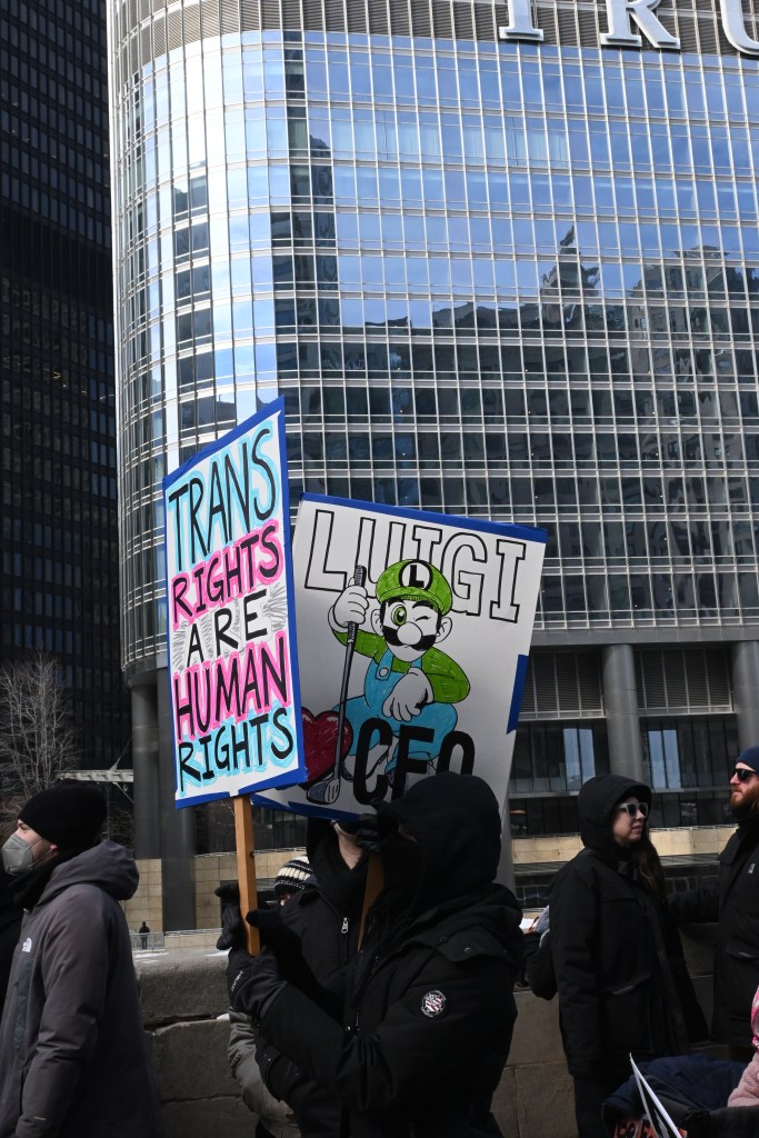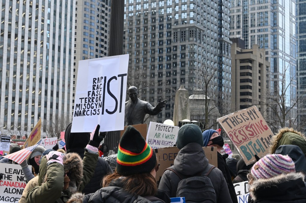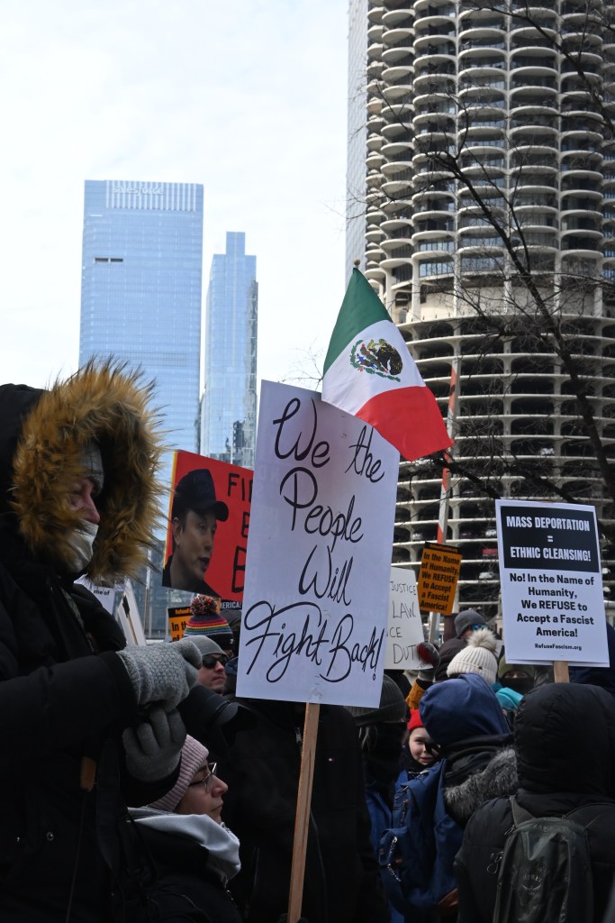 Na protest oprócz mnie przyszło jeszcze kilkaset osób. Nie za dużo. Poniedziałek, środek dnia (godz. 12 w południe), niby święto (Presidents’ Day), ale w zasadzie obchodzą to tylko oficjalne urzędy. Reszta zapierdala w pracy – dzień jak co dzień. Podziękowania należą się jednak tym ludziom, którzy przyszli! W sumie dwie grupy. Jedna wyruszyła spod “Fasolki” w Parku Milenijnym, a druga z Federal Plaza. Spotkali się na Wacker Dr., nad rzeką, tuż przy Trump Tower.