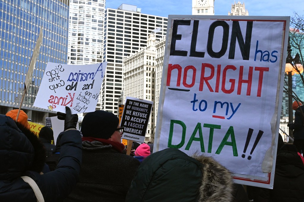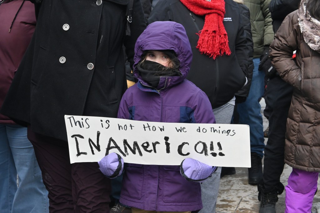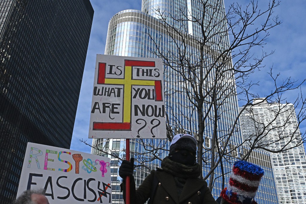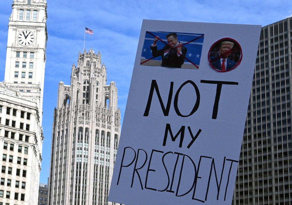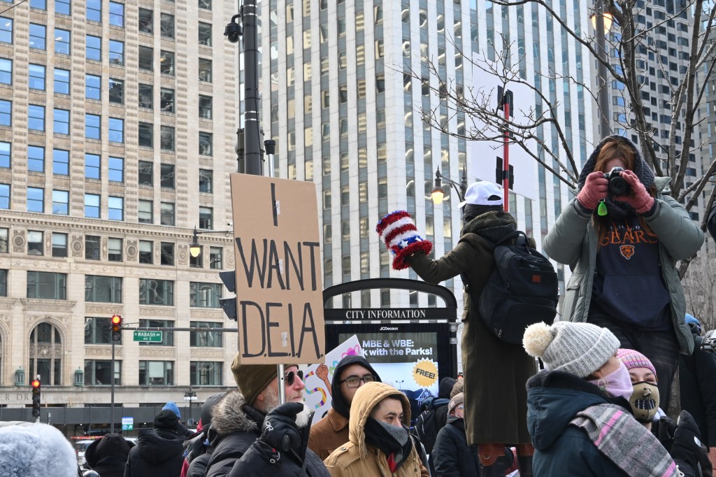 Na protest oprócz mnie przyszło jeszcze kilkaset osób. Nie za dużo. Poniedziałek, środek dnia (godz. 12 w południe), niby święto (Presidents’ Day), ale w zasadzie obchodzą to tylko oficjalne urzędy. Reszta zapierdala w pracy – dzień jak co dzień. Podziękowania należą się jednak tym ludziom, którzy przyszli! W sumie dwie grupy. Jedna wyruszyła spod “Fasolki” w Parku Milenijnym, a druga z Federal Plaza. Spotkali się na Wacker Dr., nad rzeką, tuż przy Trump Tower.