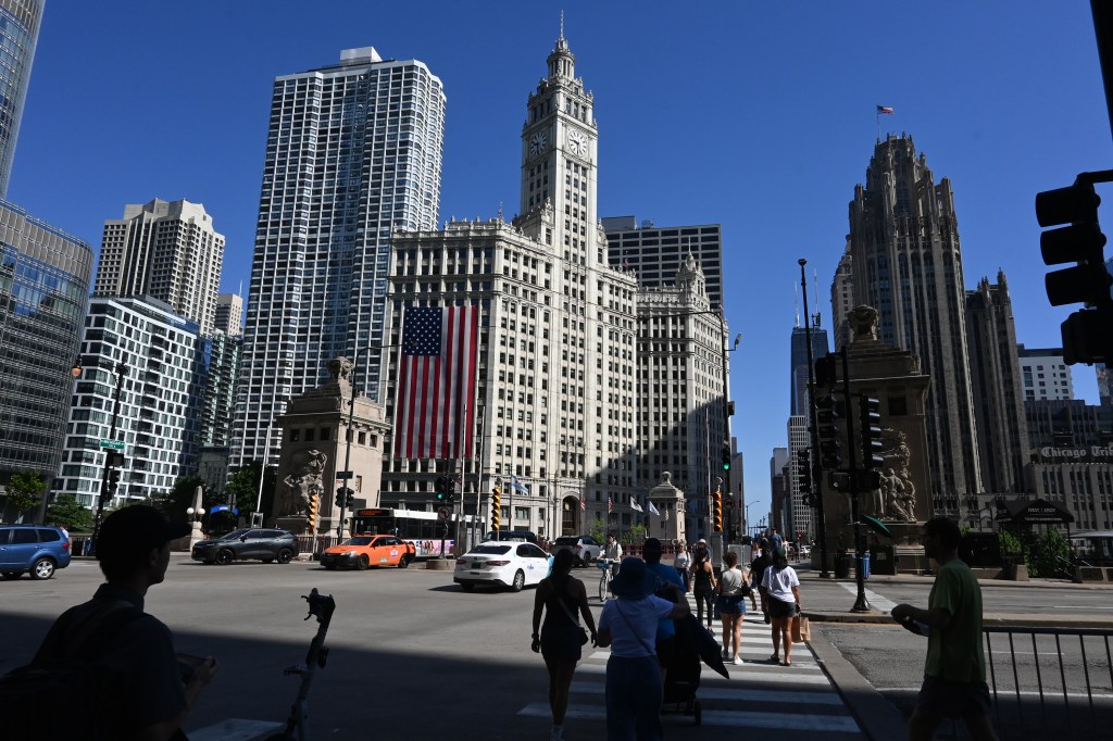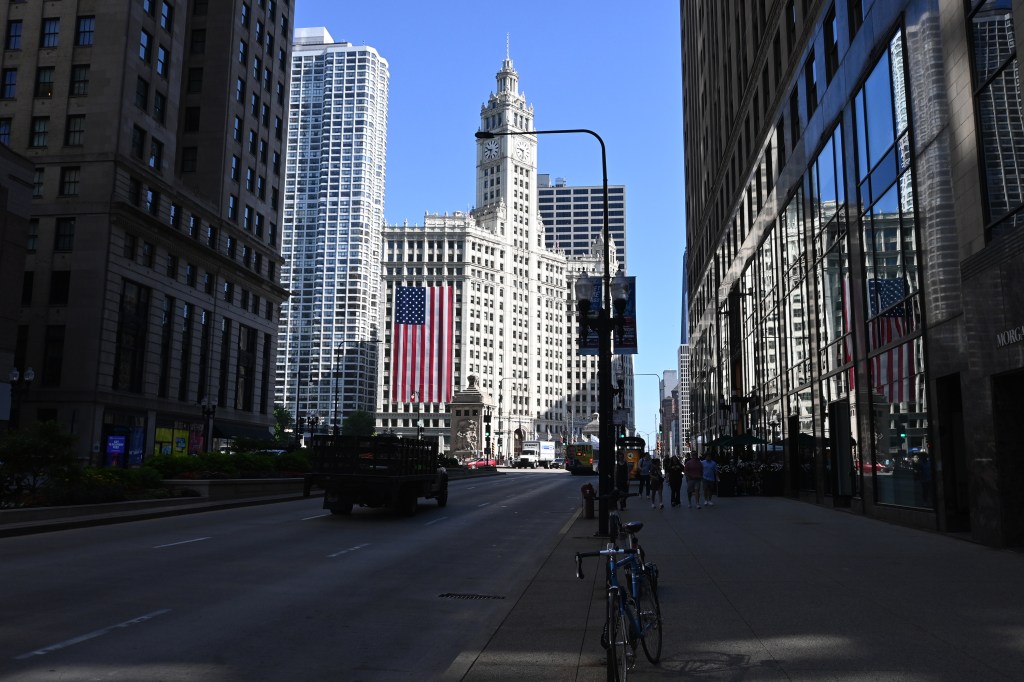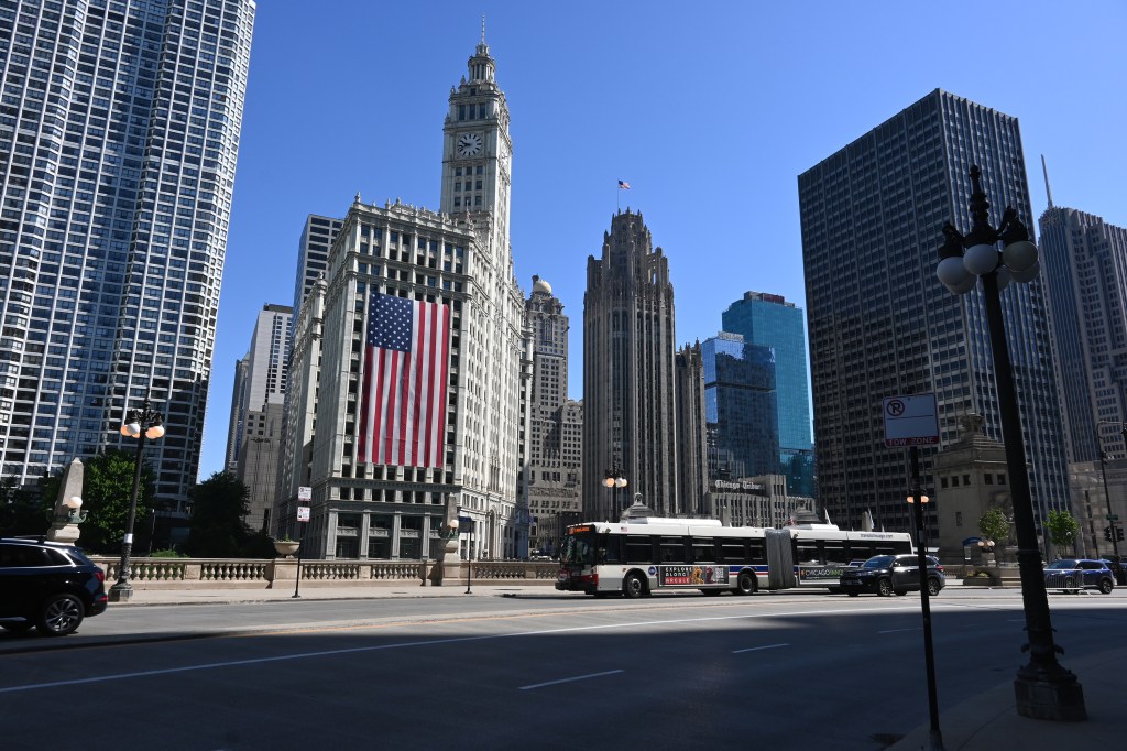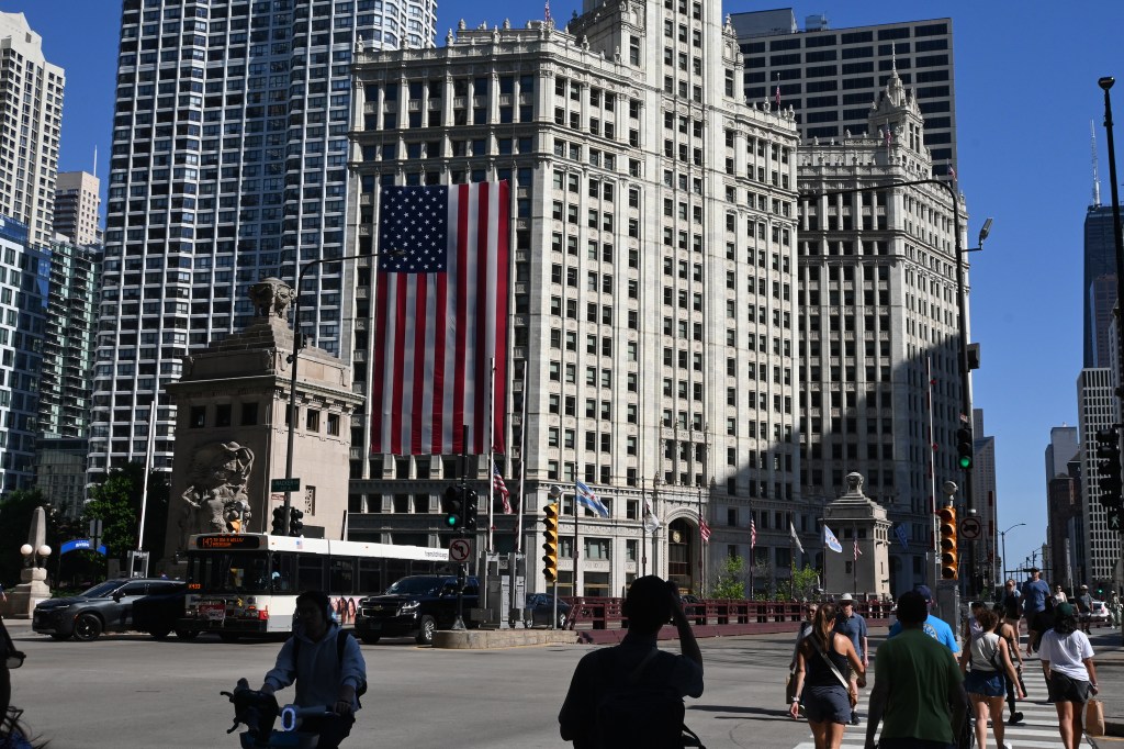 Odkąd pamiętam wisi tam zawsze na 4 lipca. Święto Niepodległości USA. Na budynku Wrigley. Robi wrażenie swoim rozmachem. Podobno ma 50 x 100 stóp. Wierzę na słowo tym, co wieszają! Zasłania widok z kilkudziesięciu okien na kilka dni. Ale nikomu to nie przeszkadza.