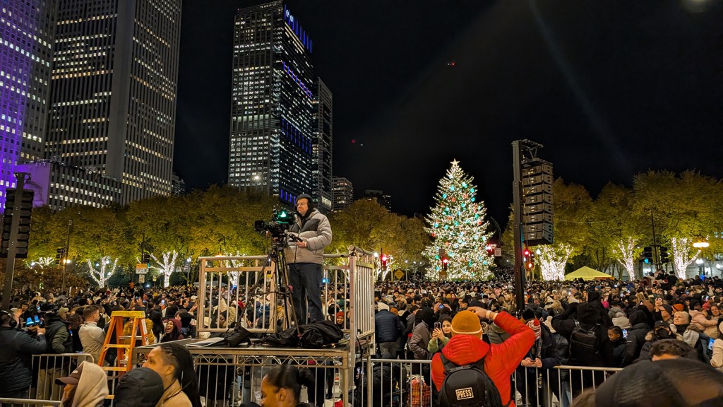 To była moja pierwsza ceremonia zapalenia lampek na żywo, na miejscu. Tak wypadło. I trzeba przyznać, że dobrym pomysłem było skorzystanie z wejściówek dla mediów, bo przy skrzyżowaniu Michigan Ave. z Washington St. pojawiły się tłumy! Nie dopchalibyśmy się tam!